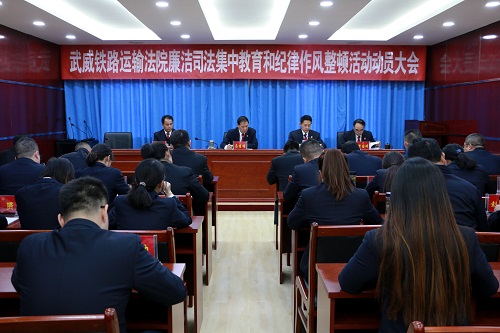 为深入学习贯彻党的十九届四中全会精神和习近平总书记视察甘肃重要讲话及指示精神,进一步提高干警的纪律意识、红线思维,确保干警做到敬纪畏法、尊规守矩,着力推动全面从严治党、从严治院主体责任和监督责任向全体干警延伸覆盖。根据上级法院的安排部署,2019年12月11日,武威铁路运输法院召开了廉洁司法集中教育和纪律作风整顿活动动员大会。会议由该院党总支书记贺国璋主持,全体干警及书记员参加会议。